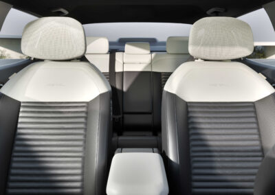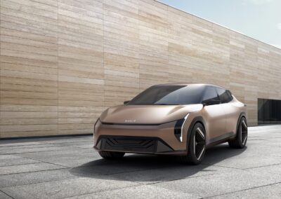 EV4 Interiør er strømlinet og har et rummeligt layout, der fremhæver stilfulde designelementer, med fokus på, at prioriterer førerens oplevelse og udsyn. Med et aggressivt udtryk komplementerer konceptbilen EV4’s progressive, teknologiske silhuet, med dens brede og imponerende front, hvor forlygterne er placeret lodret, ved de yderste kanter af motorhjelmen og frontkofangeren, som understreger Kias ambition om at udfordre udviklingen af elbiler i fremtiden-