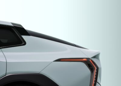 Bagfra viderefører EV4 sedan dette formsprog med en karakteristisk todelt bagspoiler, der i samspil med de lodrette baglygter understreger bilens brede stance og pionerånd. Den rene kofanger, prydet af et teknisk mønster, hvor den møder bagklappen, understreger Kias sans for detaljer og avanceret design.