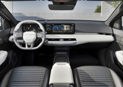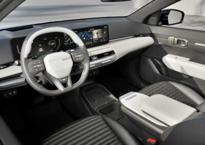 Kabinens design i Kia EV4 er skabt til at fremme en beskyttende og intuitiv forbindelse mellem føreren og bilen. Med to digitale skærme og et strømlinet instrumentpanel sikrer Kia en køreoplevelse, hvor fokus er i højsædet. Alt er nøje udformet, for hermed at minimere distraktioner, så føreren har et godt udsyn ud ad ruden.